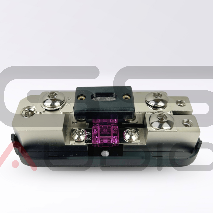 Portafusibles ANL profesional con entrada y salida para cables de hasta 50 mm², diseñado para aplicaciones de alta corriente en sistemas de audio para automóviles, náuticos, industriales o de vehículos especiales. Permite el alojamiento seguro de fusibles ANL y AFS, protegiendo contra sobrecargas y cortocircuitos en las líneas eléctricas principales. Los fusibles ya están incluidos en el paquete.
