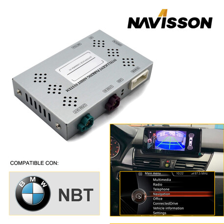 Esta interface permite añadir una cámara trasera al monitor original de un vehiculo BMW con sistema NBT de origen. Agregando líneas de estacionamiento activas y se integra con los sensores de estacionamiento del automóvil para proporcionar una visualización del estacionamiento, sin perder ninguna función original.