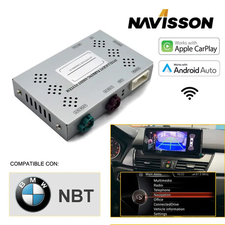 Esta interface permite añadir la funcion carplay o Android Auto a su pantalla original con sistema NBT y da la opcion de conectar una cámara trasera + una cámara delantera . Agregando líneas de estacionamiento activas y se integra con los sensores de estacionamiento del automóvil para proporcionar una visualización del estacionamiento, sin perder ninguna función original.