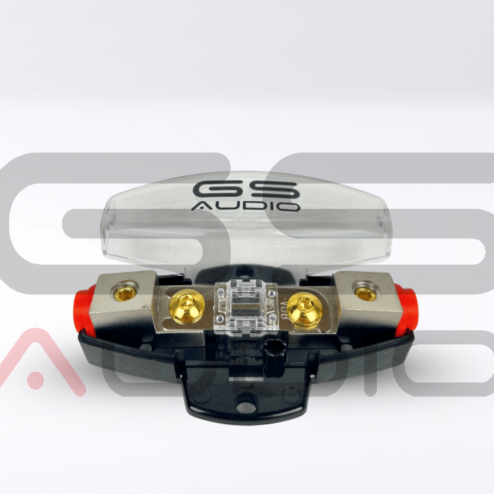 Portafusibles AFS simple GS Audio diseñado para garantizar la máxima seguridad y fiabilidad en sistemas de audio para coche de alto rendimiento. Fabricado con materiales de alta calidad, ofrece una excelente conducción gracias a sus terminales de latón chapados en oro y a su resistente cuerpo de plástico con una cubierta transparente grabada a láser con el logotipo de GS Audio.