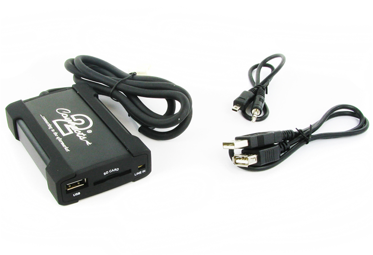 Se conecta directamente a la parte posterior de su estéreo del coche original y le permite conectar cualquier dispositivo de audio portátil como por ejemplo Disco duro USB, iPod, MiniDisk, reproductor MP3, PS2 o incluso un ordenador portátil..