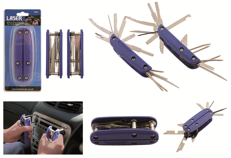 Herramienta indispensable tipo navaja que permite almacenar varias llaves extractoras auto-radio de manera ordenada, las herramientas quedan protegidas y guardadas en muy poco espacio..
