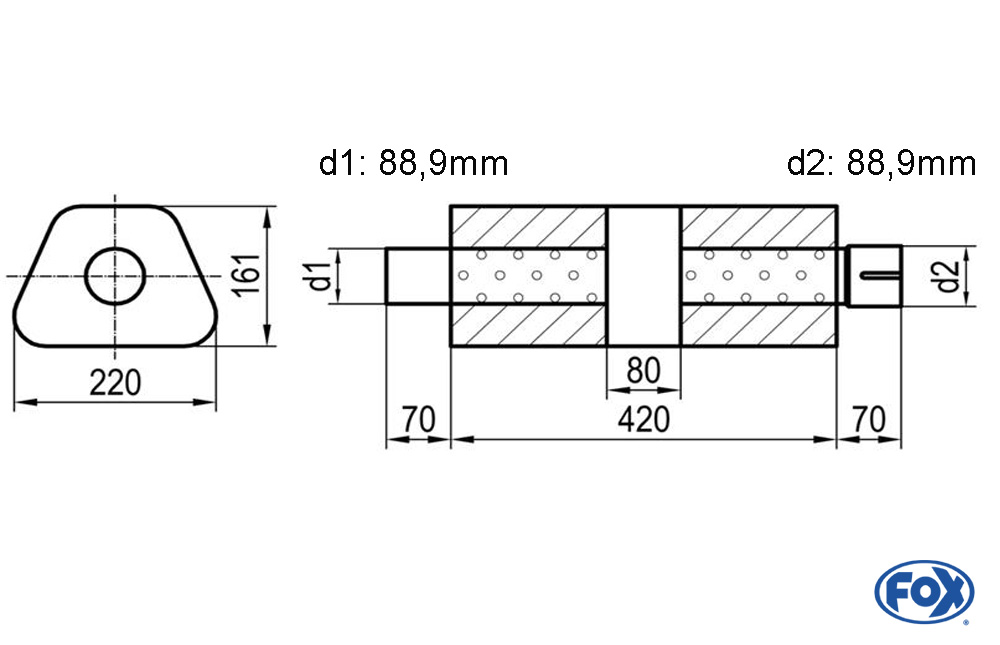 Fox Exhaust univ.-silencer oval with pipe union with housing – 644 220x161mm, d1Ø 88,9mm (outside), d2Ø 88,9mm (inside) – lenght: 420mm