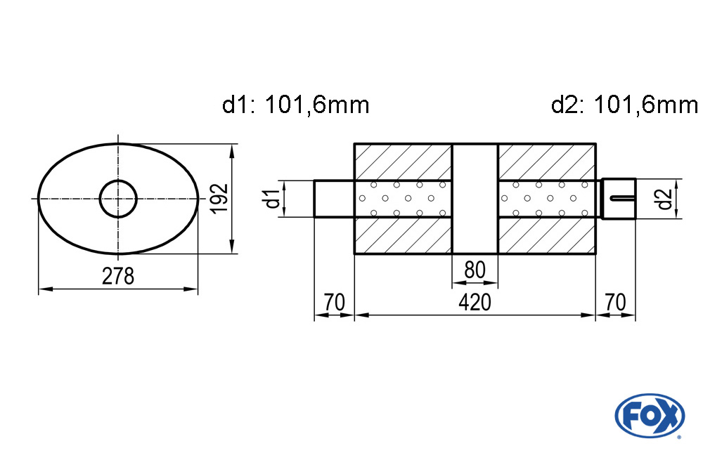 Fox Exhaust univ.-silencer oval with pipe union with housing – 754 278x192mm, d1Ø 101,6mm (outside), d2Ø 101,6mm (inside) – lenght: 420mm