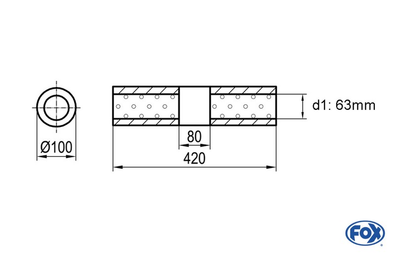 Fox Exhaust univ.-silencer round without pipe union with housing – Ø 100 Ø 100mm, d1Ø 63,5mm (outside), lenght: 420mm