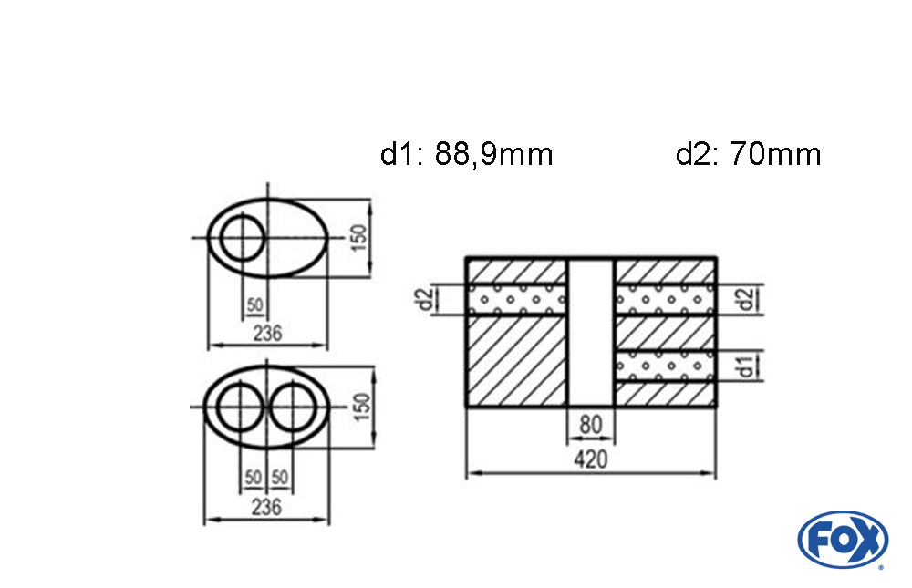 Fox Exhaust universal-silencer oval double flow with chamber – blank 618 d1Ø 88 mm d2 Ø 70mm lenght: 420mm – variant 1