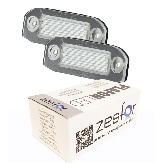 Plafones luces de matrícula led matrícula para Volvo V70 II (08-) marca ZesfOr®. Precio por kit completo de dos plafones LED, canceladores y conectores. Durabilidad infinita sin error de bombilla fundida (en coches que es necesario). Luces matrícula LED Volvo V70 II (08-) con grabado E-Mark E4/E11 homologadas para ITV. Color blanco puro.