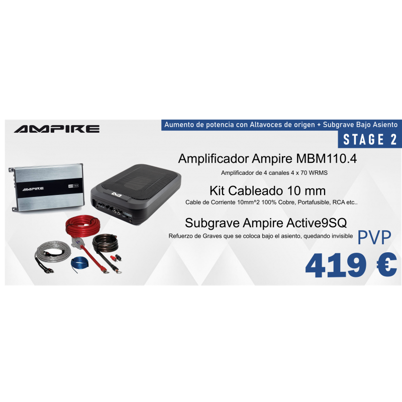 Pack de sonido orientado a aumentar tanto la potencia, la calidad y el volumen utilizando altavoces de origen del vehiculo. Aumenta considerablemente el grave con un subgrave bajo asiento.