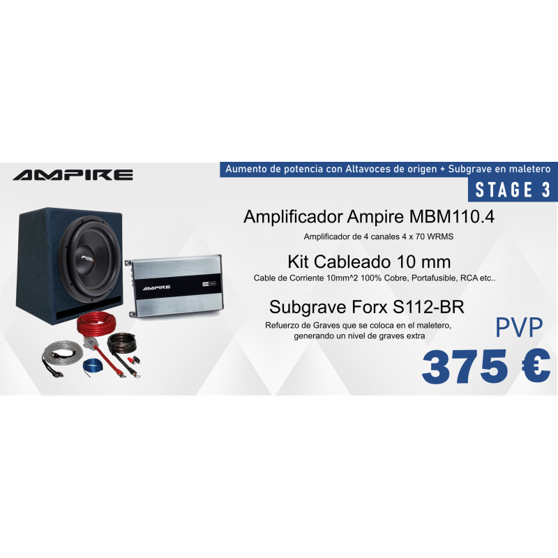 Pack de sonido orientado a aumentar tanto la potencia, la calidad y el volumen utilizando altavoces de origen del vehiculo. Aumenta considerablemente el grave con un subgrave en maletero