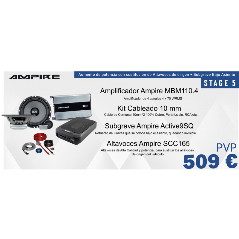 Pack de sonido orientado a aumentar tanto la potencia, la calidad y el volumen sustituyendo los altavoces de origen y mejorar el nivel de subgrave con un subgrave bajo asiento. Ideal para cualquier tipo de vehiculo donde el sonido de origen sea muy pobre.