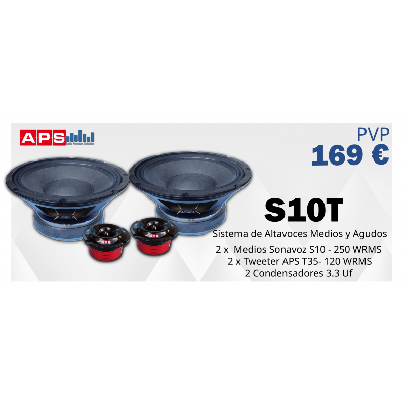 Sistema compuesto por 2 medios de 10″ Sonavoz y 2 Agudos APS T35, Filtraje 2 Condensadores 3.3 uf